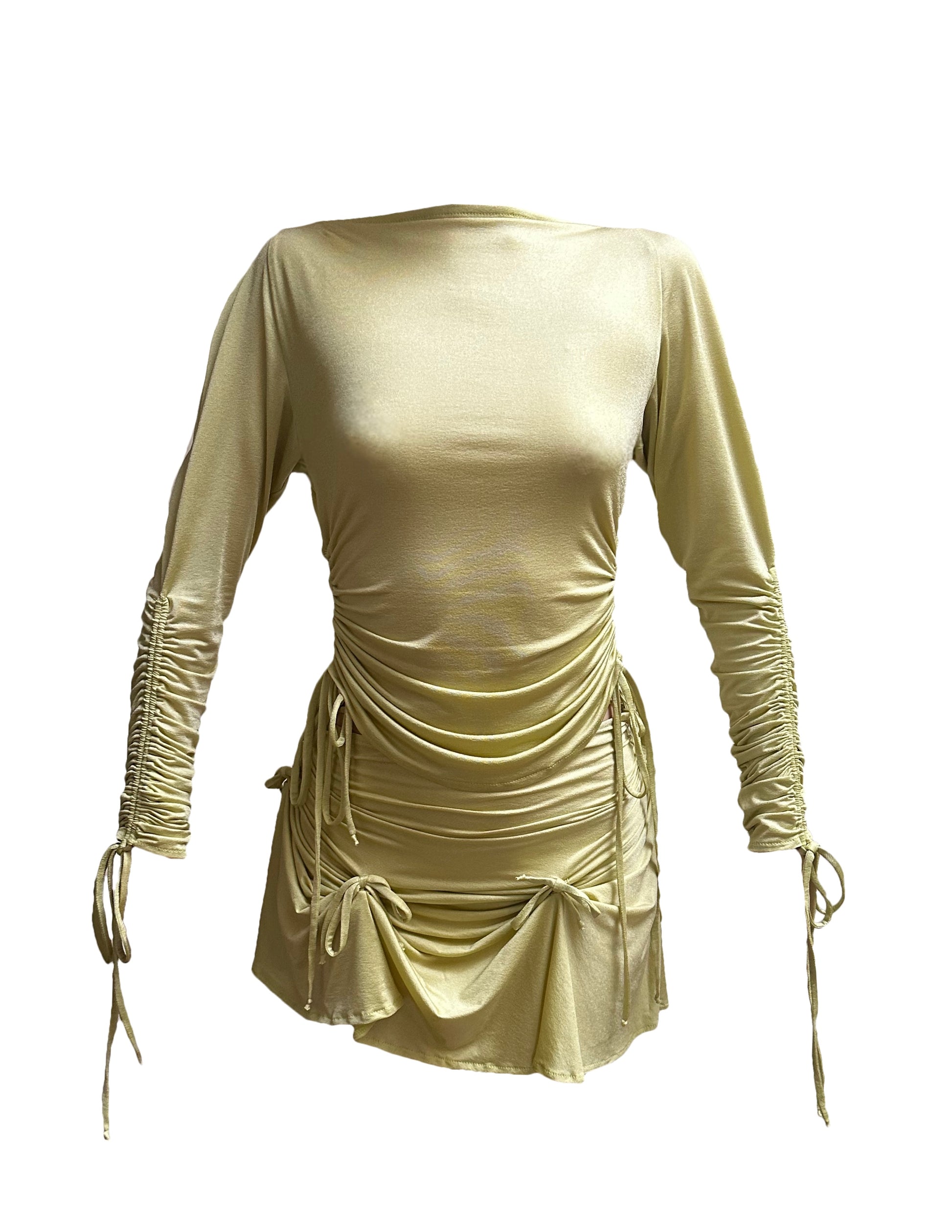 DETAILS: Ruched waist & sleeve with ties.