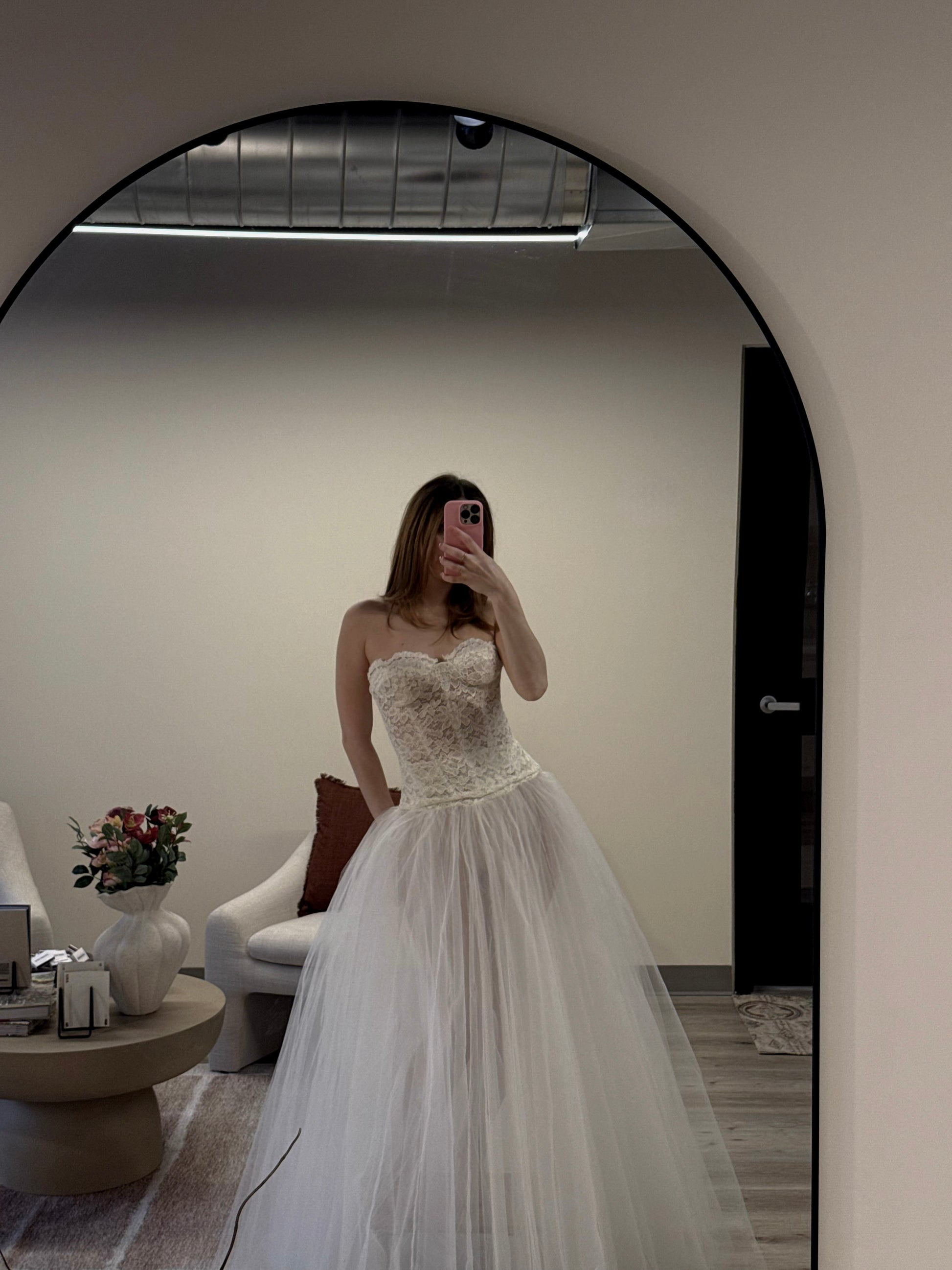 DETAILS: Waist structure with boning to provide delicate support. Tulle pleated skirt with side seam invisible zipper. Hand-finished detailing.