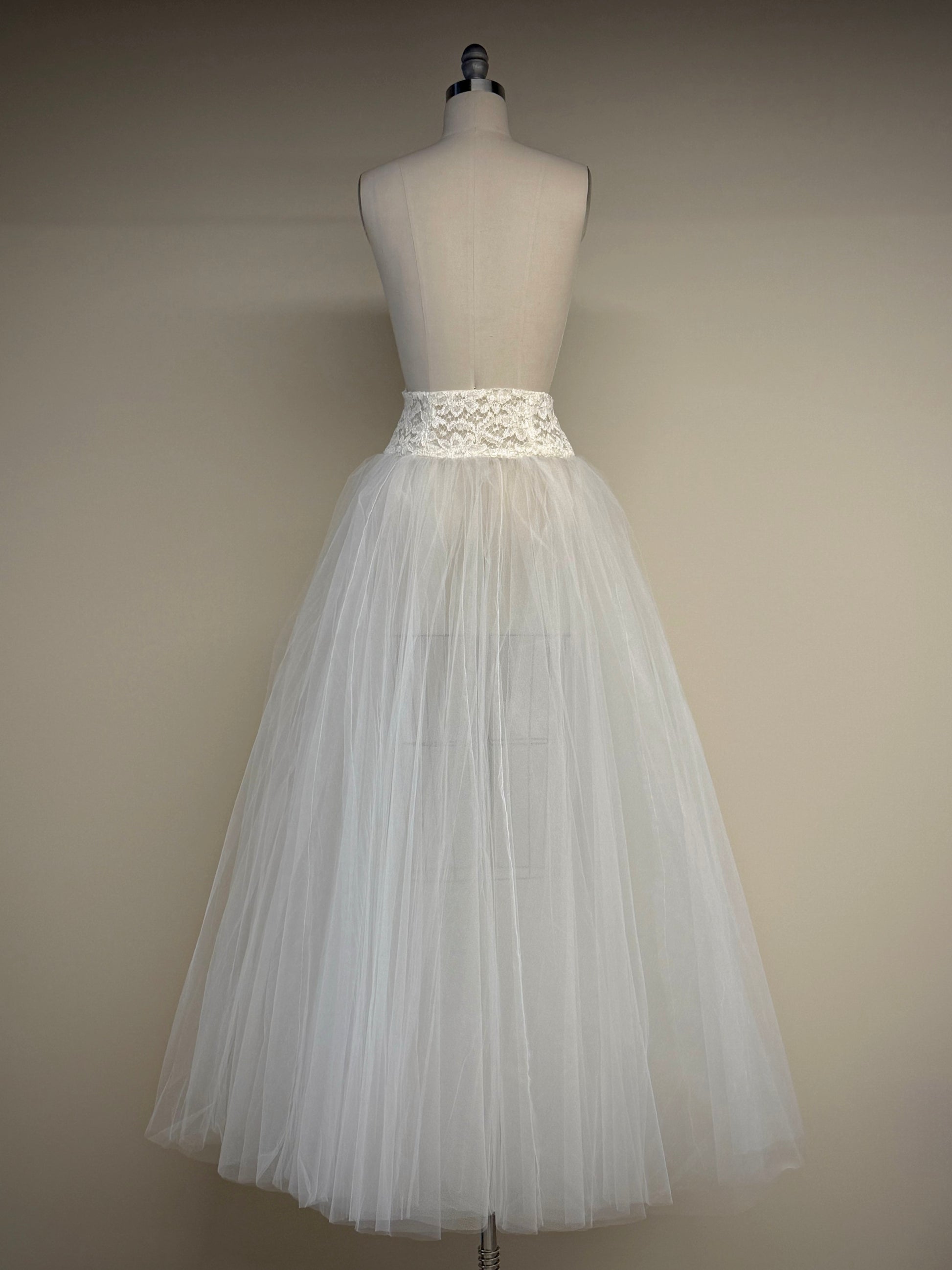 FABRIC: Waistband: Lace lined with two layers of tulle. Skirt: Tulle, lining available upon request.